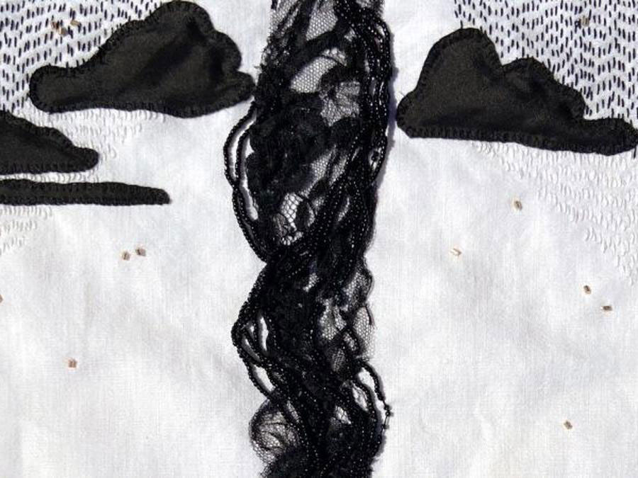 Sofie Dieu artwork: black embroidery, silk and lace scraps sewn onto white bed linen.